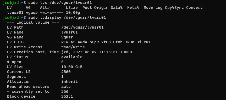 此处,使用lvs或lvdisplay即可查看lvusr01的状态,需要注意查看/dev/vgusr/lvusr01(/dev/vg-name/lv-name)。